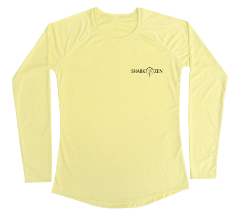 The Anglerfish swim shirt features a design that carries the focused intensity of a creature built for the dark. Printed on a Pale Yellow performance shirt in black ink, the design appears on the back, with a subtle black Shark Zen logo on the front left chest. The material is an extremely light and comfortable, high quality microfibre.