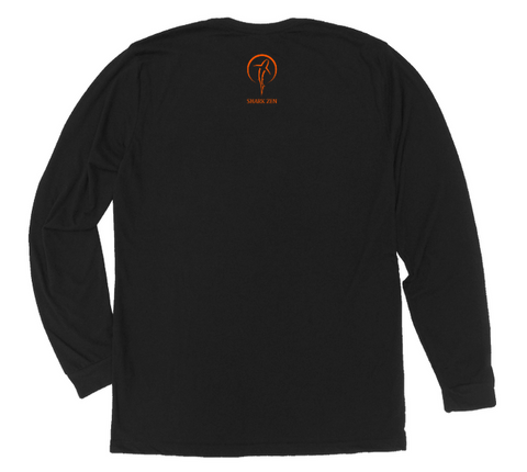 The black Shark Zen long sleeve t-shirt with orange ink features a shark swimming into a zen enso or crescent. The stylish Shark Zen symbol is filled with meaning for the ocean goer. It is featured in orange ink on the front of a premium black long sleeve t-shirt, and a subtle vertical "Shark Zen" logo is printed in the same color on the upper back just below the neck line.